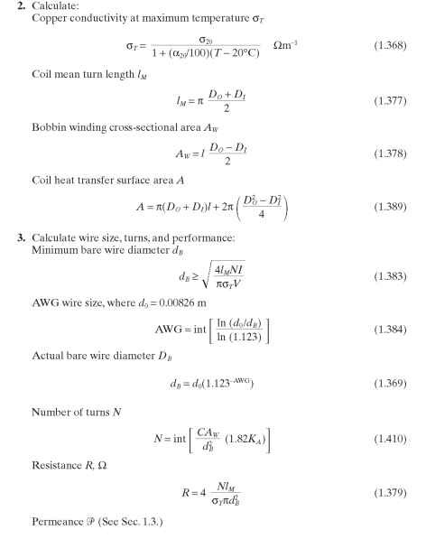 The equations given previously in Sec. 1.10 for the coil geometry, dc coil performance, ac coil performance, and copper area ratio are listed in the following two subsections. These general design procedures for dc and ac coils will determine the wire size, the number of turns, and the coil performance from the known coil voltage, bobbin geometry, and required magnetic performance NI or <).