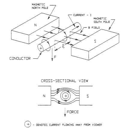 A force is exerted on a conductor if it is carrying current and is placed in a magnetic field. Fig. 1.44 shows the direction of the force when a current I flows through the conductor in the direction shown.The force F on the conductor is as follows.