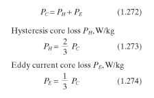 Power losses generally take the form of hysteresis loss, eddy current loss, coil electrical resistance loss, and mechanical friction. The losses that are discussed here are the losses in the magnetic material, called core loss Pc, which includes the hysteresis loss PH and the eddy current loss PE. Data from U.S. Steel for the typical 60-Hz core loss in steel motor-lamination materials (M19 through M45) indicates that approximately 67 percent of the core loss is due to hysteresis effects and 33 percent of the core loss is due to eddy current effects. The published core loss properties of magnetic materials show only the total core loss. Therefore, the hysteresis loss and the eddy current loss can be approximated as follows. The units of core loss are in power per unit mass, for example, watt per kilogram.