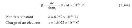 • Electron spin. The electron cannot be accurately modeled as a small current loop. However, relativistic quantum theory predicts a value for the spin magnetic moment (or Bohr magneton P) as shown following in Eq. (1.344). In an atom with many electrons, only the spin of electrons in shells which are not completely filled contribute to the magnetic moment. This factor is at least an order of magnitude larger than the electron orbit magnetic moment for ferromagnetic, antiferromag-netic, and superparamagnetic materials.
